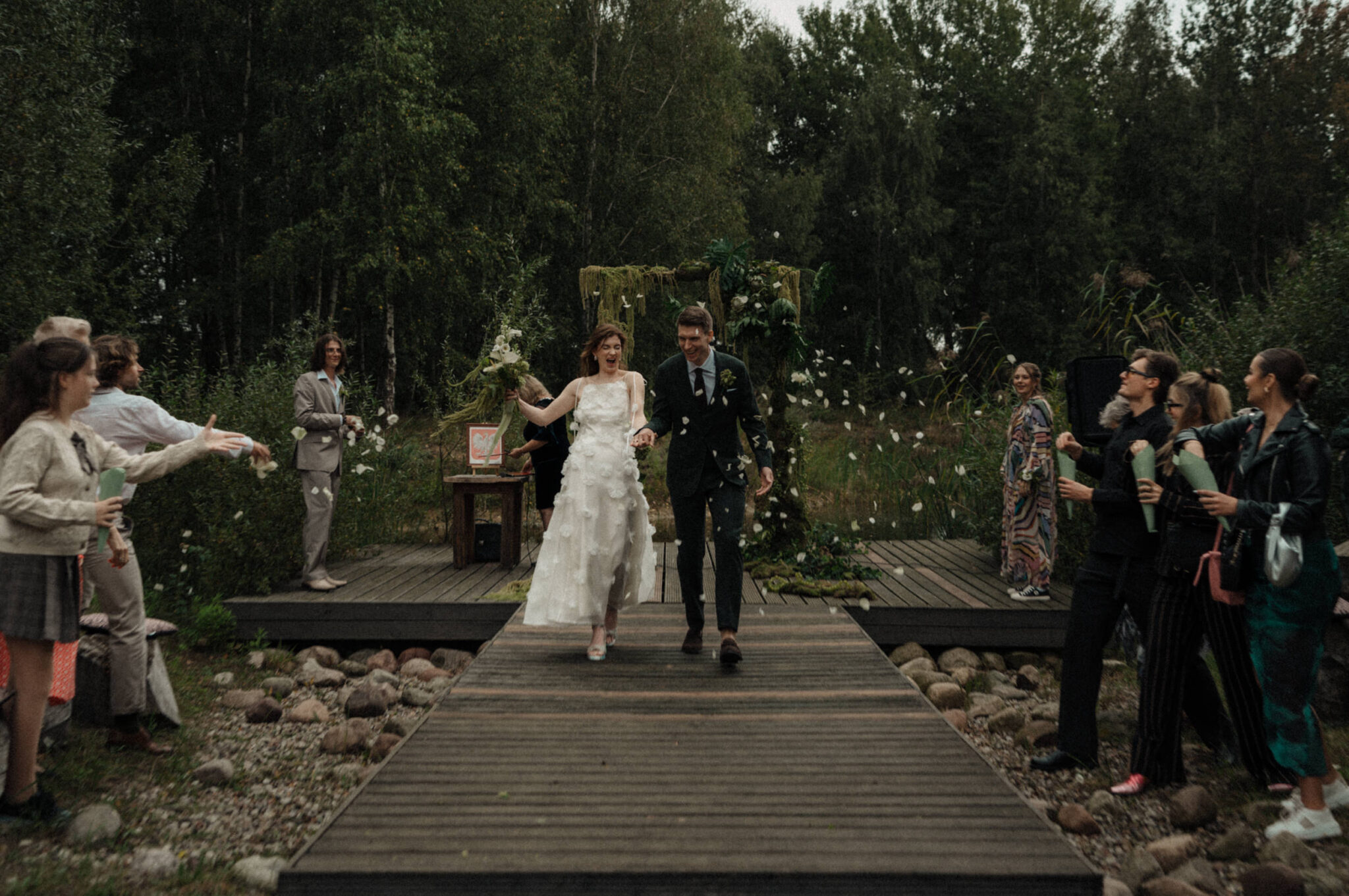 Oczyszczalnia Miejsce to przepiękna przestrzeń blisko natury, idealna na slow wedding. W dniu ślubu Oli i Antka przez cały poranek niebo było ciężkie, deszcz padał nieustannie, a ja zastanawiałam się, czy ceremonia na pomoście w ogóle będzie możliwa. Ale los, a może po prostu dobra energia tej dwójki, sprawił, że dokładnie na czas ich przysięgi deszcz odpuścił. Ola i Antek stanęli na drewnianym pomoście otoczonym przez przyjaciół i rodzinę. W powietrzu było czuć coś wyjątkowego. Nie da się tego opisać, to trzeba przeżyć. I ja miałam to szczęście, że mogłam to sfotografować.